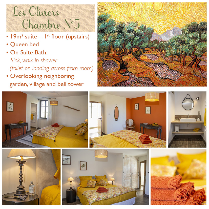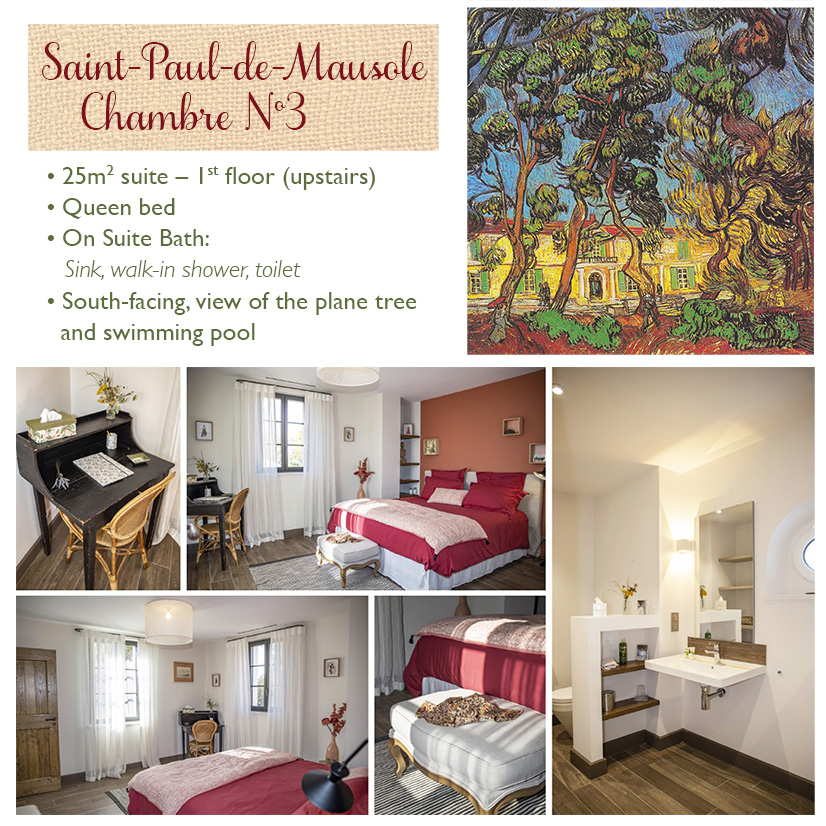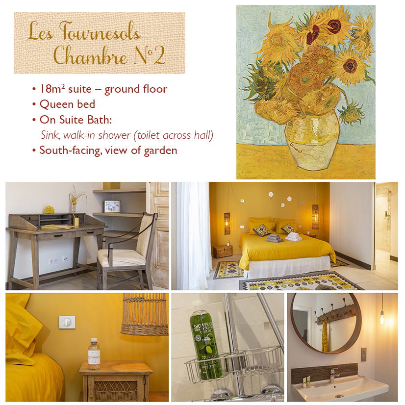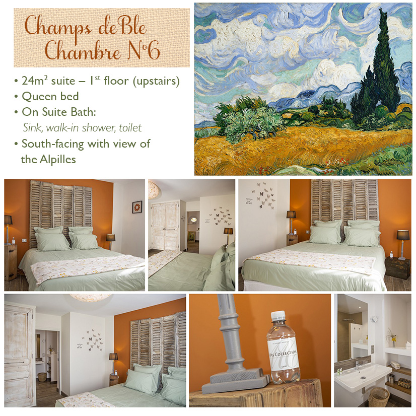 Below are the available rooms at the villa. Each room is for 1 person. Tour price depends on which room you select. Choose your room and reserve your spot on An Impressionist's Tour of Provence with Betsy Beier May 3-10, 2025 with a $1,000 deposit from the room page. If you would like shared accomodations, please email me for tour + shared room pricing.