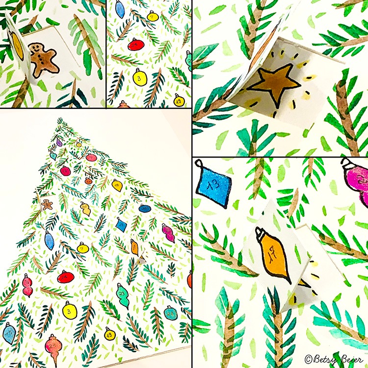 The class begins by drawing and painting with watercolors festive ornaments and a large holiday tree in an illustrative style. Following, we will create 25 individual drawings to hide under the ornaments, to be revealed when opened!