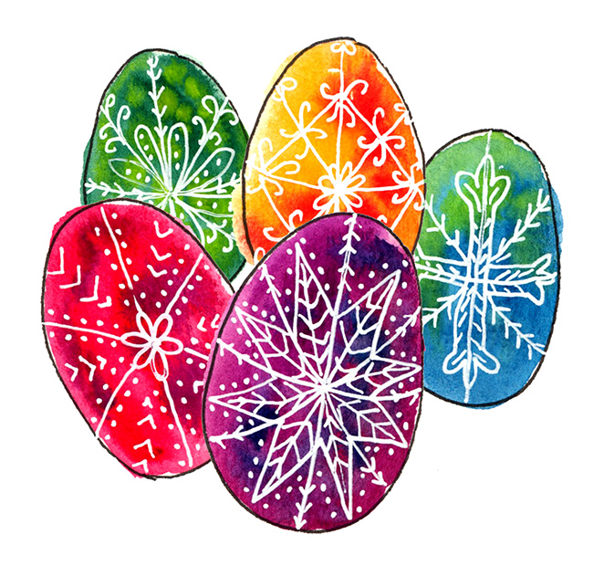 This printable lesson will teach you how to be inspired by the beautiful Ukrainian tradition of decorating eggs known as pysanky. This tradition uses a wax-resist method of creating detailed designs on eggs. Instead of real eggs, we will practice this tradition by using watercolor and a white gel or white paint pen on paper.