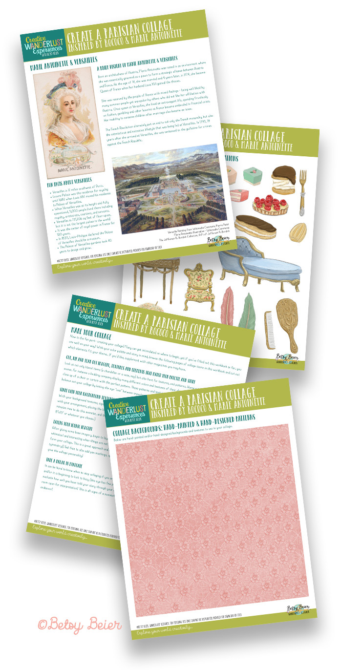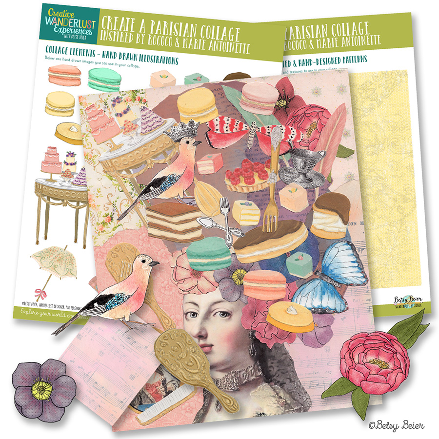 The printable workbook is filled with pages of collage materials, hand drawings, photographs, textures, vintage ephemera and more. Learn how to use the varied materials to craft your collage.